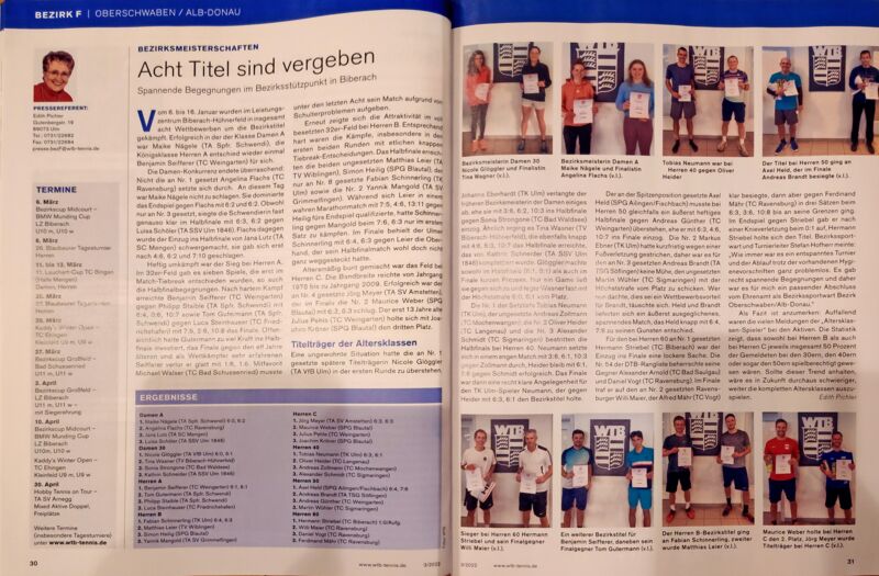 Vom 07.-09. Januar fanden in Biberach die Bezirksmeisterschaften statt. Jörg Meyer von der Amstetter Tennisabteilung war auf Grund seiner Leistungsklasse auf Position 4 der Setzliste und bekam damit in der ersten Runde ein Freilos. Im ersten Spiel wurde es nach einem Durchhänger im zweiten Satz eng und es musste der Match-Tie-Break entscheiden.